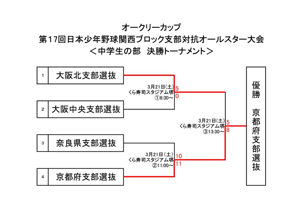 オークリーカップ第17回関西ブロック支部対抗オールスター大会の中学生の部最終日は、3/21(土)にくら寿司スタジアム堺で開催され、京都府選抜チームが優勝を飾りました。チーム関係者の皆様、おめでとうございます。