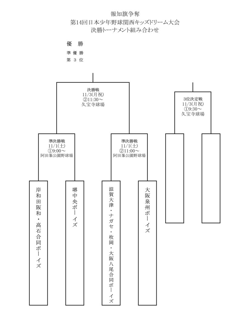 【組合せ】報知旗争奪第14回関西キッズドリーム大会・決勝トーナメント 2025年10月19日 最終更新日時 : 2025年10月19日 boys-kansai-wp 10/18(土)予選リーグを勝ち上がった4チームで決勝トーナメント抽選会が行われました。 11/1(土)阿田峯公園野球場で準決勝、11/3(月祝)久宝寺球場で決勝、3位決定戦が行われます。