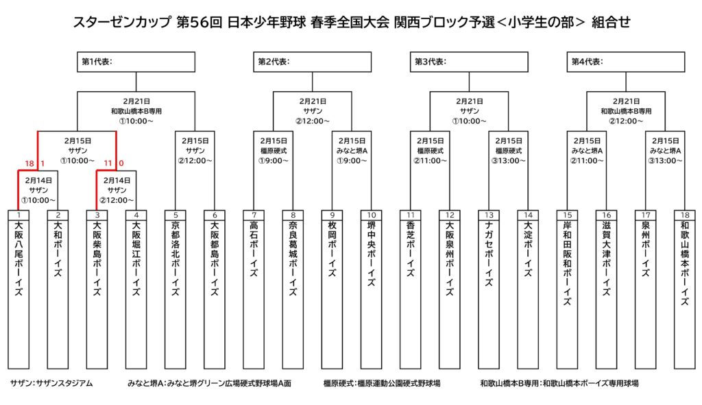 2/14(土)サザンスタジアムにて行われたスターゼンカップ第56回春季全国大会関西ブロック予選<小学生の部>・1日目の試合結果です。