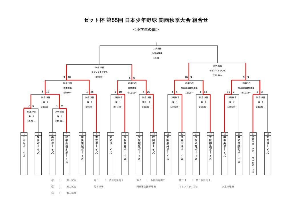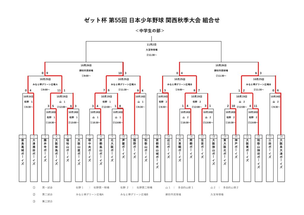 10/25(土)荒本球場、阿田峯公園野球場、みなと堺グリーン広場にて行われたゼット杯第55回関西秋季大会・3日目の試合結果です。