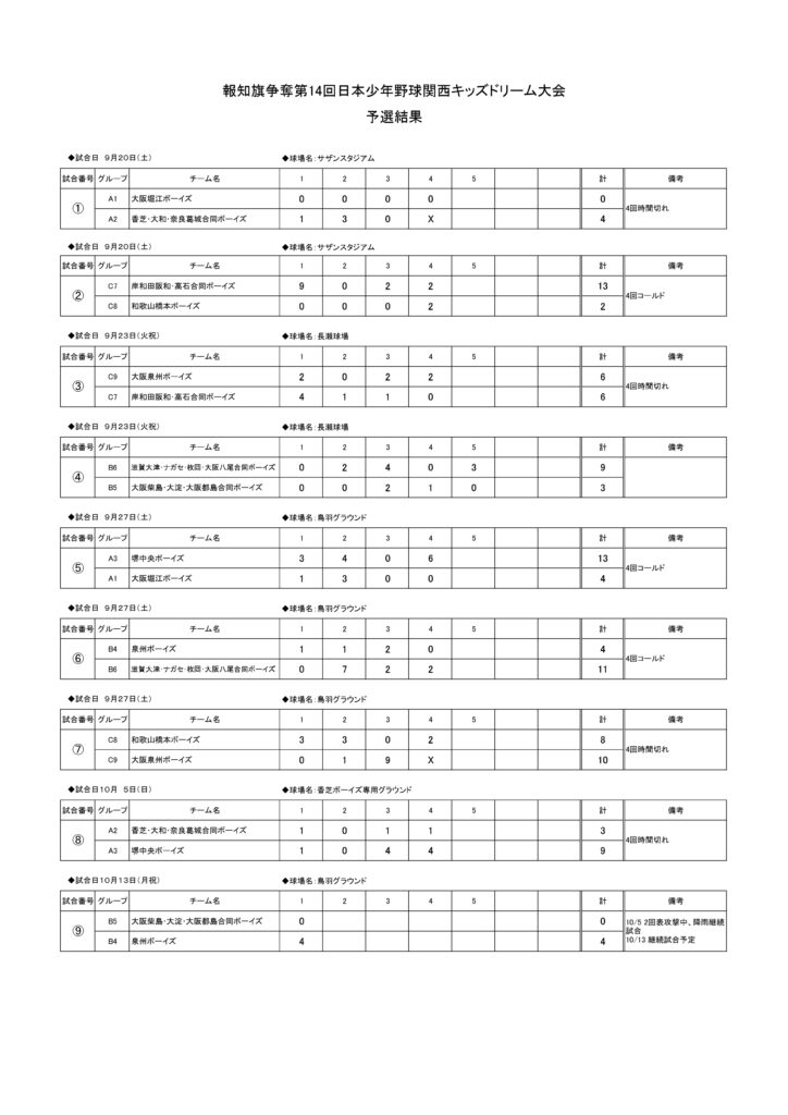 10/5(土)香芝ボーイズ専用グラウンドにて行われた報知旗争奪第14回関西キッズドリーム大会・予選リーグの試合結果です。
